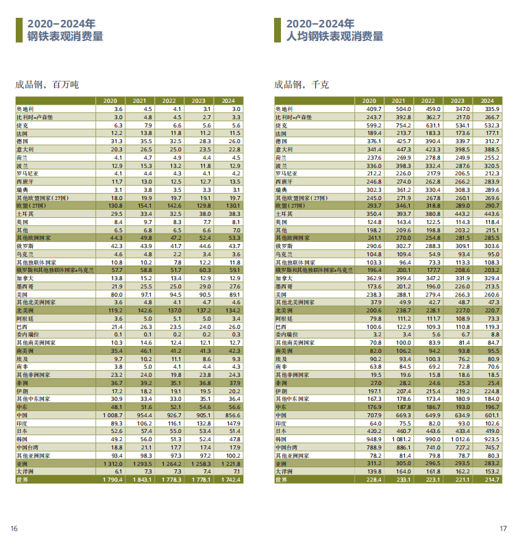 2024年全球鋼鐵表觀消費量17.42億噸,人均消費量214.7千克。中國以8.57億噸消費量居首,人均601.1千克;印度消費1.48億噸,人均102.6千克,顯示出發展中大國的需求潛力。從區域看,亞洲消費占比超七成,歐洲和北美分別占7.5%和7.7%。